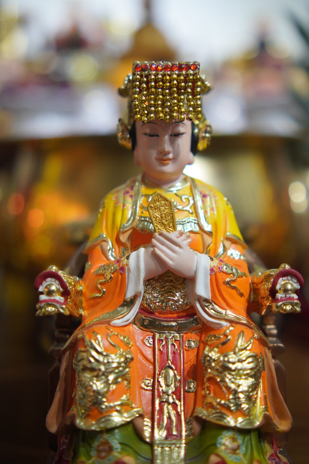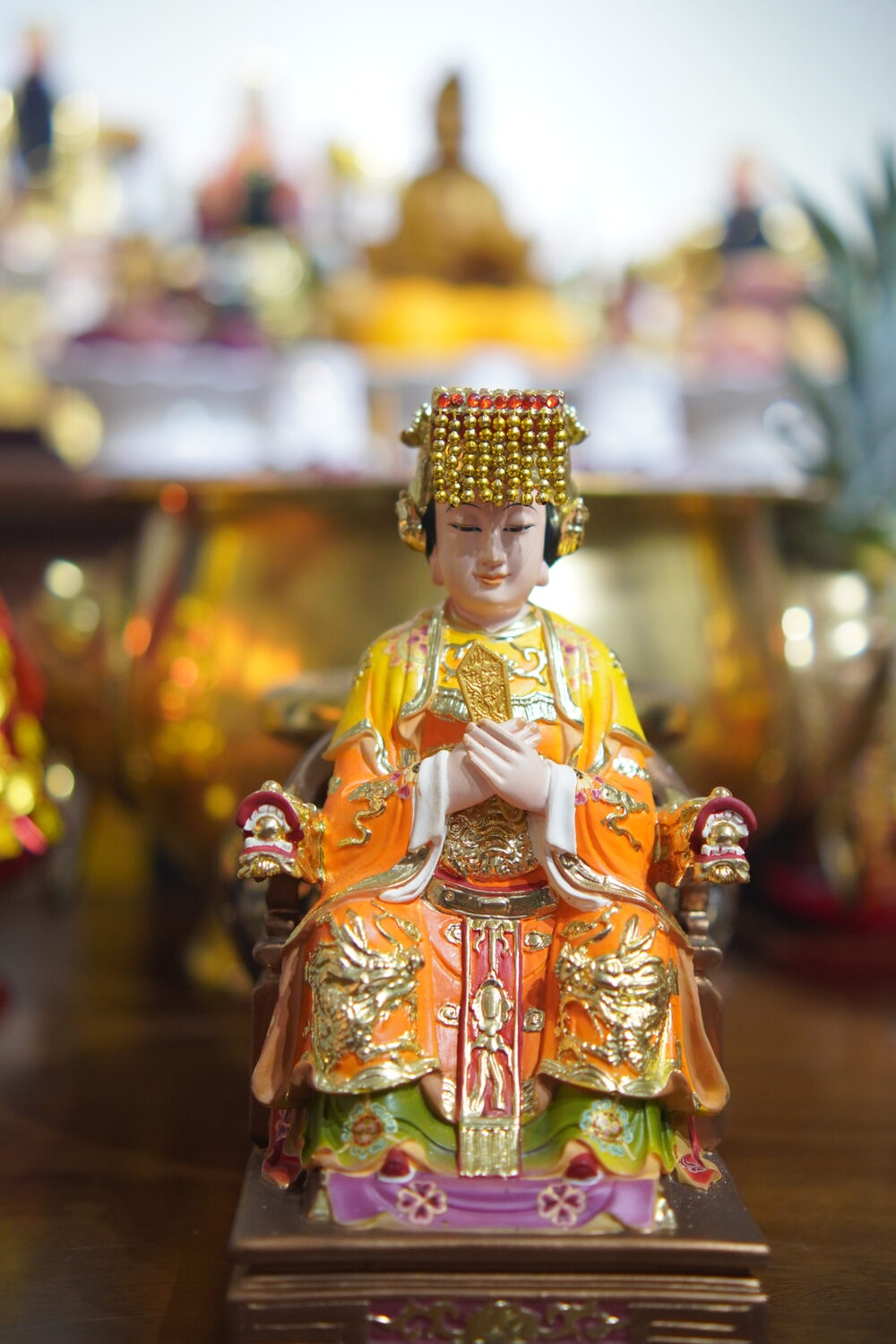 天后娘娘又稱天上聖母、媽祖,原名林默,自幼聰慧過人,為人占卜禍福,終身未嫁。羽化後,常在海上顯靈,能使颱風轉向,原本撞醮的船隻安全繞過,化險為夷。