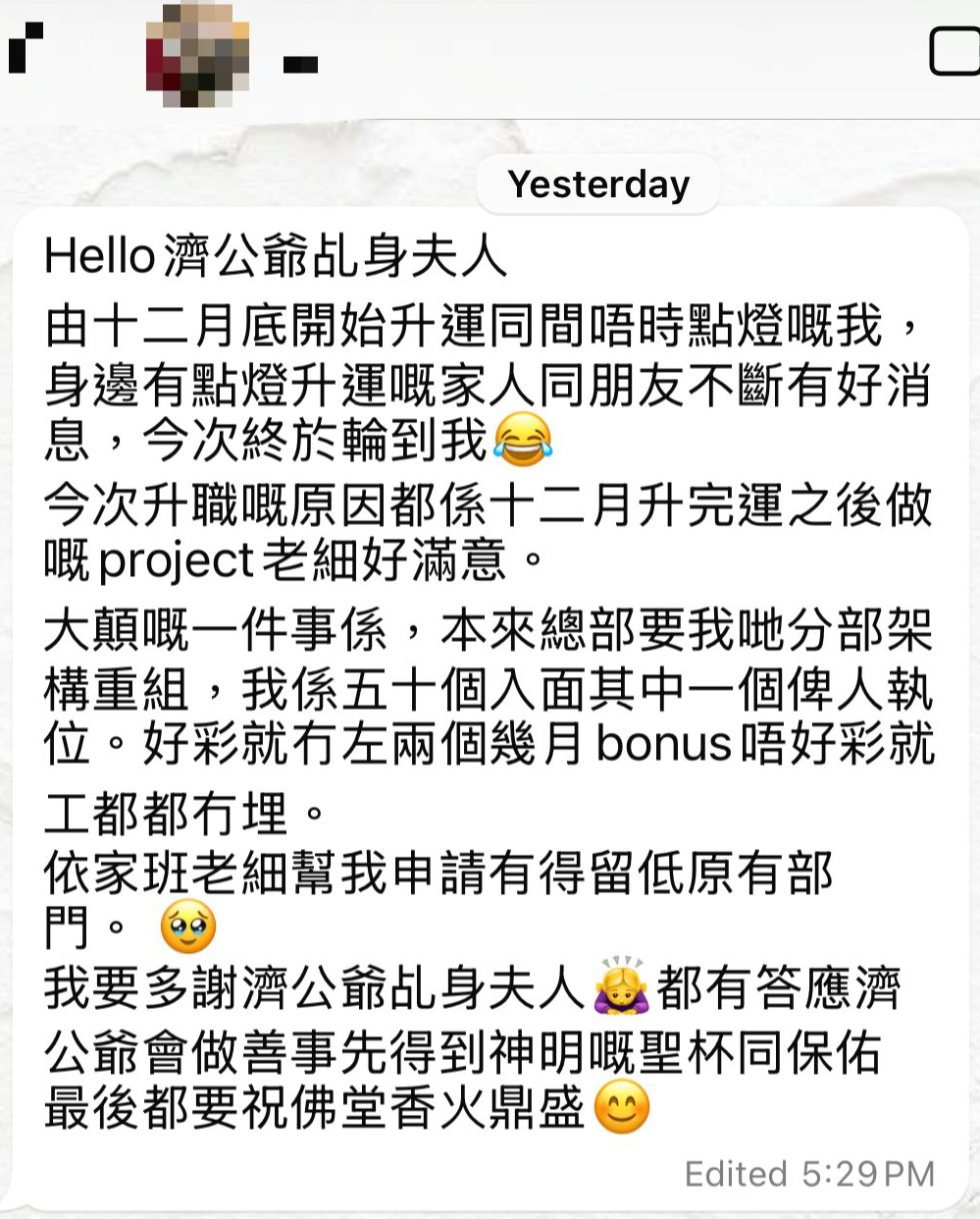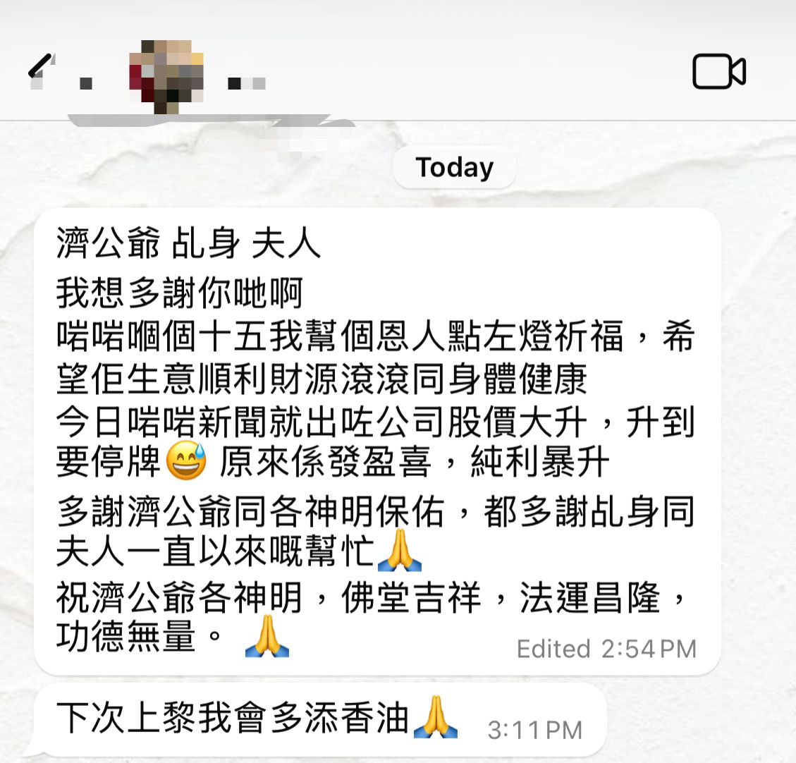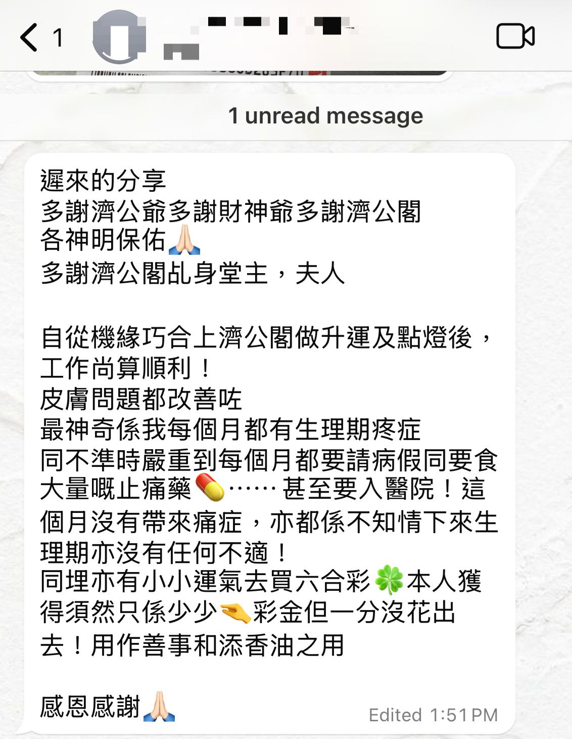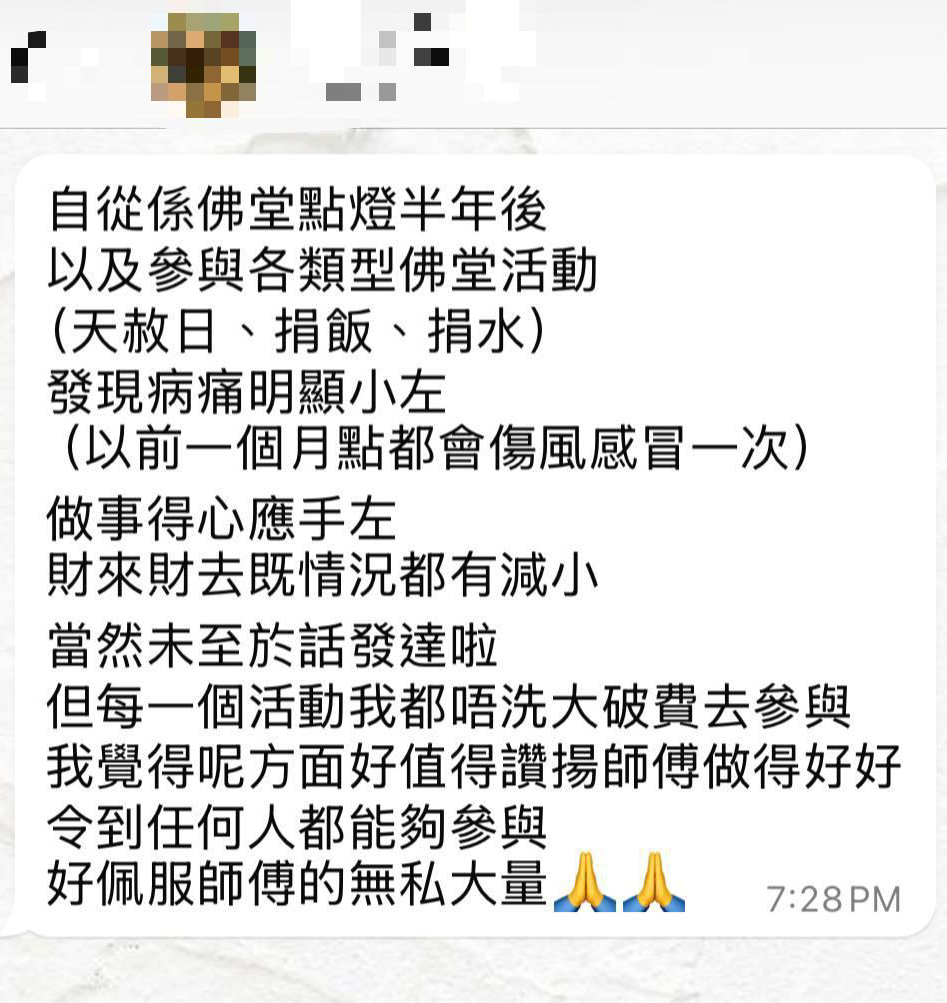 點燈象徵光明與智慧,透過燈的能量向神明傳遞自己的心願。在神明的指引下,能驅除信眾內心的恐懼與煩惱,令善信有足夠的力量與智慧去破除一切障礙,達成願望。點一盞燈,破千年暗,願力所至,無願不遂。 每逢農曆初一、十五,佛堂舉行點燈祈福儀式。堂主透過點亮光明燈,為善信祈求諸事順遂。在神明庇佑下,光明燈光芒熾盛,照亮每一位前行的路,助善信事業、學業、仕途都能收穫滿滿,一帆風順。